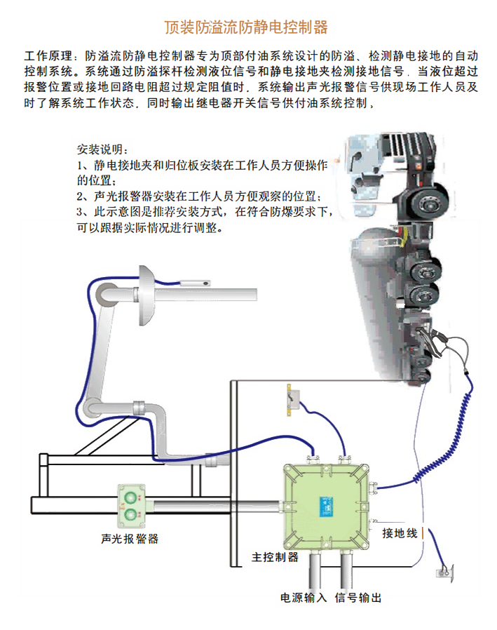 工作原理:防溢流防靜電控制器專為頂部付油系統(tǒng)設(shè)計(jì)的防溢、檢測(cè)靜電接地的自動(dòng)控制系統(tǒng)。系統(tǒng)通過防溢探桿檢測(cè)液位信號(hào)和靜電接地夾檢測(cè)接地信號(hào),當(dāng)液位超過報(bào)警位置或接地回路電阻超過規(guī)定阻值時(shí),系統(tǒng)輸出聲光報(bào)警信號(hào)供現(xiàn)場(chǎng)工作人員及時(shí)了解系統(tǒng)工作狀態(tài),同時(shí)輸出繼電器開關(guān)信號(hào)供付油系統(tǒng)控制,